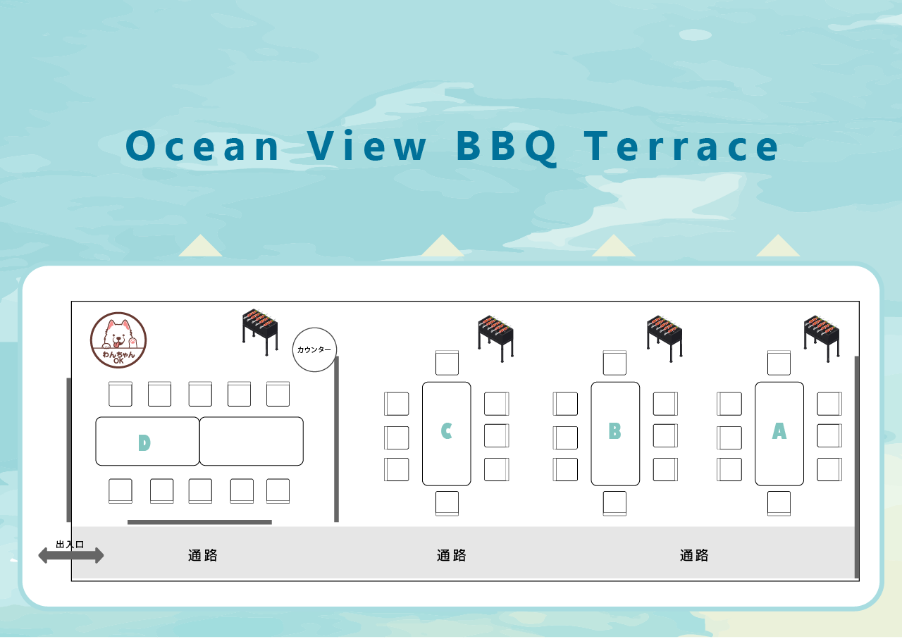 ワンちゃんと一緒なら、Dエリアへ。 愛犬と一緒に海を眺めながらBBQを楽しめる専用エリアがあります。最大10名まで利用できるので、わんちゃん連れのご家族同士で集まるのにもちょうどいい広さです。